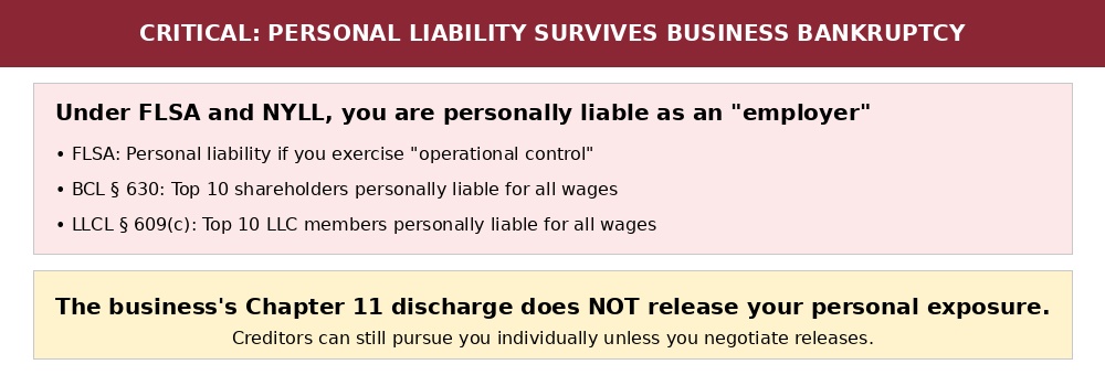 Under both FLSA and NYLL, you are personally liable as an “employer” if you exercised operational control. The automatic stay protects the debtor entity—not you. Creditors can still pursue you individually while the business case is pending, and a confirmed plan that discharges the business’s debts does not discharge your personal exposure.