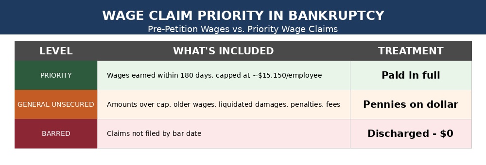 Not all wage claims are treated equally. Understanding the distinction between pre-petition wages generally and priority wage claims specifically is crucial: