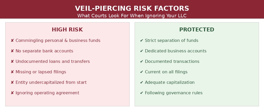 The veil doesn’t pierce itself. It gets pierced when owners treat their entities as extensions of themselves rather than separate legal persons. Keep the money separate. Document the big stuff. Stay current on filings. Follow your own rules. Do these things consistently, and your liability protection will hold up when you need it most.