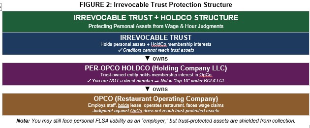 Your restaurant continues to operate through its OpCo—the LLC or corporation that employs staff, holds the lease, signs vendor contracts, and faces wage claims. Judgments against the OpCo—or against you personally as an “employer” under the FLSA—cannot reach the trust-protected assets above. The OpCo sits at the bottom of the structure, insulated from your personal wealth.